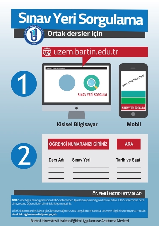 Dönem sonu sınavı yerinizi ve saatinizi sitemizde yer alan Sınav Yeri Sorgulama modülünü kullanarak  07 Ocak 2026 tarihinden itibaren öğrenebilirsiniz. Duyuruları takipte kalınız.